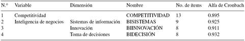 En la Tabla 7 se indican los componentes de cada variable, sus ítems o preguntas del cuestionario y el nivel de confiabilidad medido por el alfa de Cronbach. En la variable de estudio "competitividad" se seleccionaron 13 ítems, y en la variable "inteligencia de negocios" se utilizaron 25 ítems, divididos en 3 dimensiones: sistemas de información con, 9 ítems; innovación, con 8 ítems, y toma de decisiones, con 8 ítems.