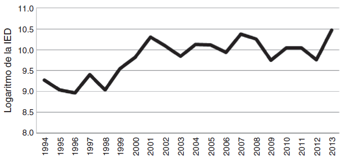 Por ejemplo, en un estudio elaborado por Oladipo (2007), el autor investiga el efecto de la IED en el crecimiento económico de México antes y después del TLCAN, sus resultados encuentran evidencia de un efecto positivo aunque también sostiene que el efecto de las exportaciones es comparativamente mayor. Estos resultados son confirmados posteriormente en el trabajo elaborado por Oladipo y Vásquez (2009). En otro estudio, de la Cruz, Canfield y González (2009) también encuentran evidencia de un efecto positivo por parte de la IED en el crecimiento económico de México, sin embargo, los autores sostienen que este efecto se observa principalmente en el crecimiento de la producción industrial e incidentalmente en el crecimiento de la producción en el sector servicios. Asimismo, encuentran que la IED también ejerce un efecto favorable como promotor del comercio internacional al observarse un efecto significativo en las exportaciones. En un trabajo más reciente, Romero (2012, (2014) encuentra que el efecto del capital extranjero en el crecimiento económico de México entre 1984 y 2011 es reducido y menor que el capital privado nacional, quizá por la débil presencia de encadenamientos de la IED con la economía nacional, lo cual sugiere que el capital extranjero debe ser considerado como complementario a la inversión privada nacional.