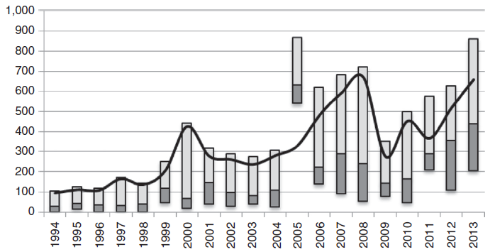 Aunque las modificaciones a la Ley de Inversión Extranjera enfocadas a la eliminación de barreras al ingreso de IED al país han continuado hasta la actualidad (Lichtensztejn, 2012), debe mencionarse que después del notorio incremento observado hasta 2001, el flujo de IED ha transitado por una segunda etapa caracterizada por una elevada volatilidad en el corto plazo y también por una tendencia estable en el largo plazo. En este sentido, las fluctuaciones de corto plazo están enmarcadas en la reciente crisis financiera internacional que ocasionaron las disminuciones en el flujo de IED captada en México entre 2008 y 2009; y en concordancia con el entorno internacional de la IED, una nueva caída en 2012. Sin embargo, aunque el flujo de IED en México parece retomar una senda de recuperación a partir de 20134, su dinámica ha sido estable con un modesto crecimiento medio anual de 1.3 por ciento entre 2001 y 2013 (fig. 1).