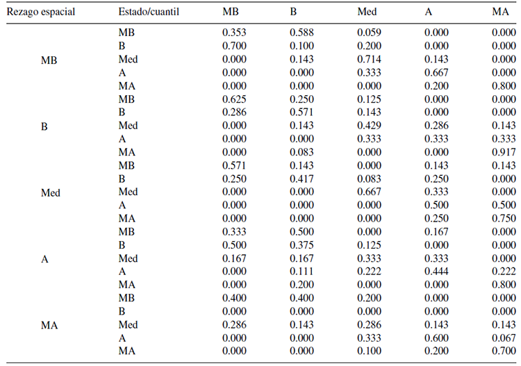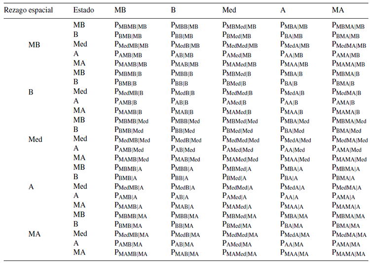 Esta versión espacial de la matriz de transición considera la dependencia espacial en forma de rezago espacial, es decir, condiciona la probabilidad de una región específica de transitar hacia un estado o clase, al estado o clase en que las regiones vecinas se encontraban inicialmente. Esta forma de incorporar la interacción espacial al análisis de la dinámica implica que la matriz P deja de tener dimensión kxk en su versión clásica para tener dimensión kxkxk. De acuerdo con Rey (2001), esta versión espacial permite conocer la influencia que las regiones vecinas tienen en la transición de un estado a otro de una región específica.