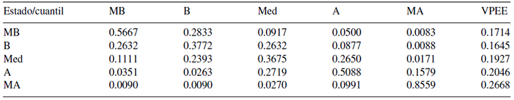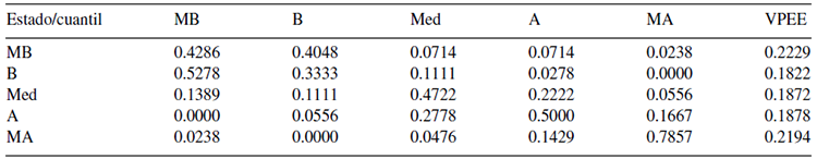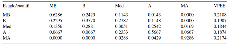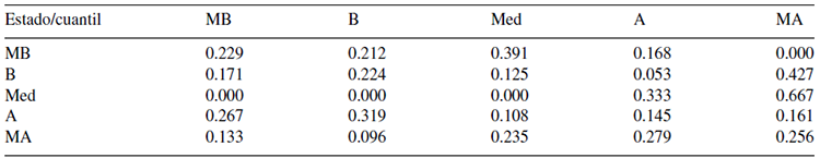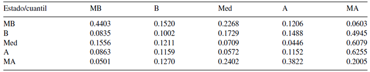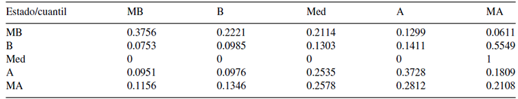 Con la finalidad de esclarecer la elaboración e interpretación de la matriz de transición espacial, en la tabla 1 se presenta su organización. Se supone una matriz con k=5 estados o clases definidas como muy bajo (MB), bajo (B), medio (Med), alto (A) y muy alto (MA). Esta definición corresponde al número de clases mutuamente excluyentes calculados mediante cuantiles, y que en este estudio tiene el objetivo de distinguir la capacidad de captación de IED regional a través del tiempo. En particular, la notación PBB|B expresa la probabilidad de una región de transitar de un estado o clase bajos (B), hacia otro también bajo (B) en un periodo de tiempo, condicionado a que sus regiones vecinas inicialmente formaban parte de un estado o clase también bajos (B). Similarmente, la notación PBA|A indica la probabilidad de una región de transitar de un estado o clase bajos (B) hacia un estado o clase alta (A), condicionado a que interactúa espacialmente con vecinos que se encuentran en el estado o clase alto (A). En este sentido, la matriz de transición espacial expresa con detalle el movimiento de una región hacia estados o clases más altas o bajas a través del tiempo, considerando la influencia favorable o desfavorable de interactuar espacialmente con regiones que se encontraban en estados o clases mayores, inferiores o iguales.