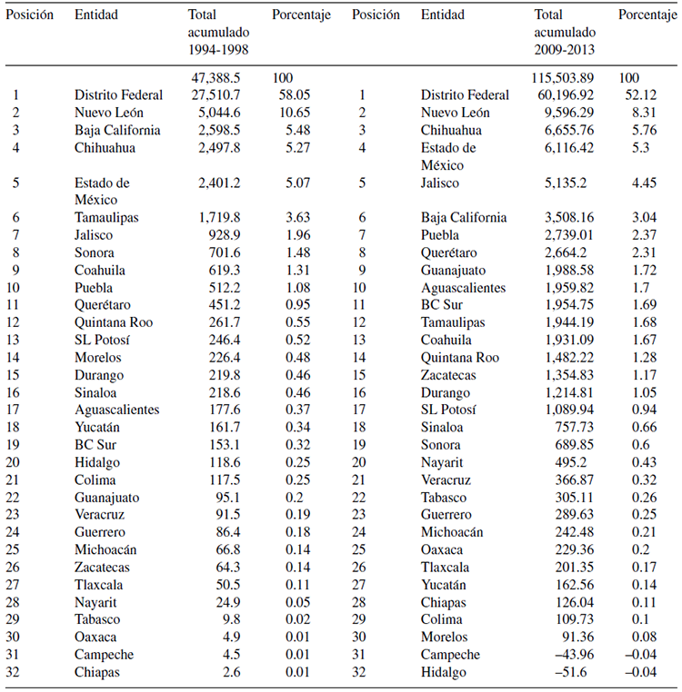 Al respecto, en el anexo 1 (véanse los anexos) se presenta la inversión extranjera directa acumulada en los periodos 1994-1998 y 2009-2013 con fines comparativos. Ahí se aprecia que una sola entidad, el Distrito Federal, captó consistentemente más del cincuenta por ciento de la IED acumulada en ambos periodos; seguida con una distancia notable por Nuevo León, entidad que logró captar el 10.6 por ciento en el primer periodo, y con una pequeña disminución en su participación, el 8.31 por ciento en el segundo periodo. Algunas entidades han visto reducida su capacidad de atracción notoriamente; por ejemplo, Baja California redujo su participación de 5.48 a 3 por ciento, disminuyendo tres posiciones en ambos periodos. Por su parte, aunque Tamaulipas tuvo un pequeño incremento en la captación acumulada, su participación se redujo de 3.6 a 1.7 por ciento también en ambos periodos. Notablemente, el estado de Hidalgo ha atravesado por un proceso de pérdida de IED que ha ocasionado una importante disminución en su posicionamiento como receptor de la misma.