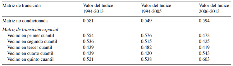 El análisis de la evolución espacio-temporal de la inversión extranjera directa, mediante el cálculo de la matriz de probabilidades de transición, sugiere que la divergencia regional en la captación de este activo es un proceso que parece afianzarse cuando se analizan diferentes cortes en el tiempo. De hecho, cuando la dinámica se condiciona a la interacción espacial se observa que en el primer periodo de 1994 a 2005 el proceso de divergencia parece ser conducido por una transición hacia clases de mayor captación cuando interactúan con estados ubicados en las clases B, Med y A, en tanto que en el periodo más reciente, de 2006 a 2013, el proceso de divergencia hacia clases mayores estaría impulsado por las regiones que interactúan con vecinos en las clases menores MB, B y Med.