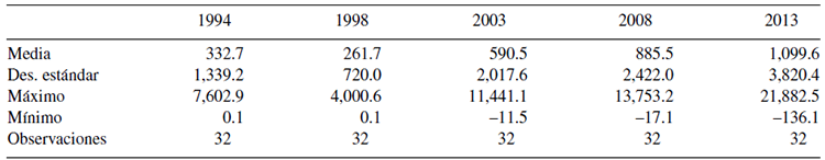 En la tabla 2 se observan algunas características de la IED regional mediante estadísticas básicas. Por ejemplo, el promedio regional se ha incrementado aproximadamente tres veces entre 1994 y 2013; sin embargo, también se ha incrementado la dispersión medida a través de la desviación estándar. Rasgos que confirman el comportamiento de la IED observado en la fig. 2. De hecho, esta dispersión se refleja en en el incremento en términos absolutos para los valores máximo y mínimo de la IED captada por las entidades federativas del país.