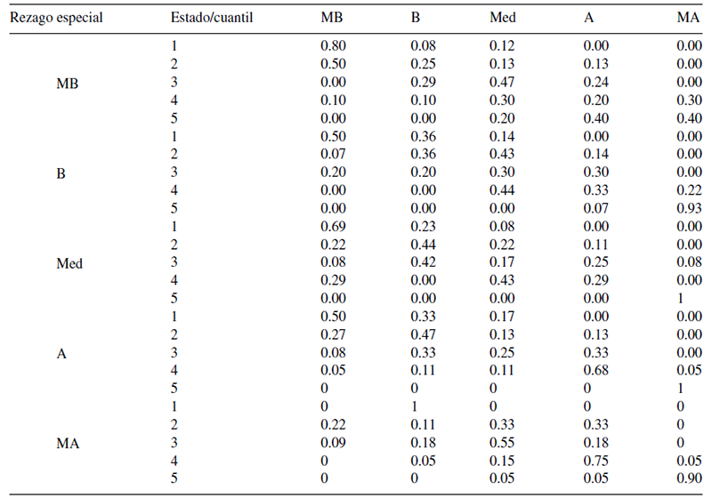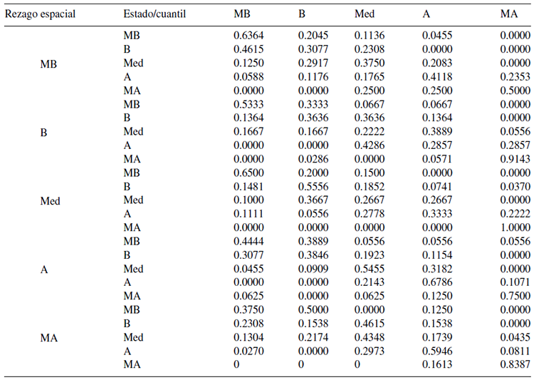 Por ejemplo, las regiones asociadas con vecinos que pertenecen a las clases B, Med y A tienen probabilidades de 49, 60 y 62 por ciento, respectivamente, de transitar hacia el grupo de regiones en la clase MA.