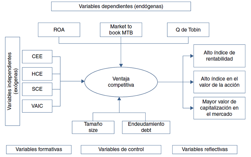 El estudio es correlacional-causal ya que se han formulado 6 hipótesis para demostrar la relación que existe entre el VAICTM y sus componentes, CEE, HCE y SCE, como variables formativas, con el rendimiento sobre activo total (ROA), como medida financiera, el Market to Book (MTB) como valor de capitalización de mercado de la empresa y la Q de Tobin (Q) como el nivel del valor de la acción (sobrevaluada/subvaluada), teniendo como variables de control el tamaño de las empresas mexicanas (SIZE) y el nivel de endeudamiento (DEBT) que conforman la muestra, con un nivel explicativo, proponiendo un sentido de entendimiento de las relaciones entre tales variables (véase figura 1).