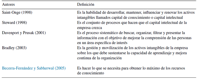 Diversos autores se han dado a la tarea de conceptualizar el término gestión del conocimiento, con distintas perspectivas y enfoques, por lo que en la tabla 1 se presentan estas definiciones.