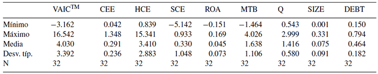 Entre los valores obtenidos se observan la media, los mínimos y máximos, la desviación típica de los saldos promedios de los diferentes coeficientes calculados para la determinación del VAICTM, las variables dependientes y de control. De conformidad con las cifras que integran la base de datos de las 32 empresas sujetas a estudio, y partiendo del valor de la media del VAICTM que es de 4.030, 10 empresas se ubican por arriba de la media (31.25%) y las otras 22 (68.75%) por debajo. Las 5 primeras compañías que reportan el mayor índice en el promedio de los años 2006-2012 son CMOCTEZ con 16.5415, HOMEX con 10.082, HERDEZ con 8.7924, PEÑOLES con 7.1339 y GMEXICO con 6.366. Las compañías que tienen los 5 menores índices son HOGAR con -3.1615, SANLUIS con 0.7299, ICA con 0.8468, SIMEC con 0.8677 y GCC con 1.6376. Cabe resaltar que el comportamiento del VAICTM refleja la misma tendencia en cada uno de sus componentes, estos son, en el CEE, HCE y SCE.