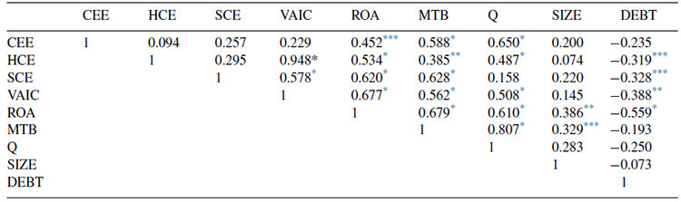 Se llevó a cabo el análisis de la matriz de correlaciones con el cual se determinó el coeficiente de correlación entre las variables independientes VAICTM, CEE, HCE, SCE, y las dependientes ROA, MTB, Q, y de control SIZE y DEBT.