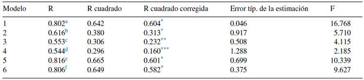 La tabla 12 contiene los resultados generados por cada uno de los análisis llevados a cabo en los 6 modelos de regresión lineal, de los cuales se puede destacar que todos son significativos, por lo cual son concluyentes en cuanto a afirmar que existe relación lineal entre las variables independientes y las variables dependientes en su conjunto, aunque se identifica que algunas son débiles como a continuación se explica.