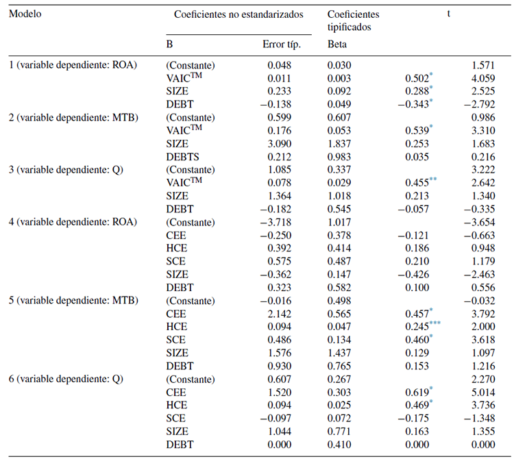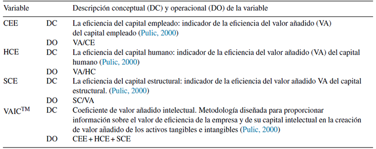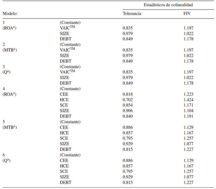 En la tabla 5 se presentan como variables independientes al VAICTM y sus componentes (CEE, HCE y SCE) calculadas a partir de datos publicados y auditados por las empresas que conforman el estudio.