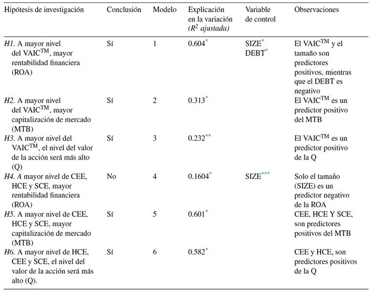 Se ha comprobado que el VAICTM y los coeficientes CEE, HCE y SCE sí inciden e impactan positivamente en elementos claves como son la rentabilidad financiera ROA como se demostró en la hipótesis 1, la capitalización de mercado MTB revelado en las hipótesis 2 y 5, y en el nivel del valor de la acción Q manifestado en las hipótesis 3 y 6 de las empresas del sector industrial en México, así como el SIZE de estas en la hipótesis 1, con lo cual se validan y se reconocen estas 5 hipótesis que afirman tal incidencia e impacto (no así la hipótesis 4). Asimismo, se ha probado que mientras una empresa tenga un mayor índice de, los valores de su capital intelectual se verán reducidos y afectados negativamente, como lo refleja la hipótesis 1.