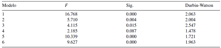 Para la validación de los modelos se examinaron los supuestos a través del estadístico Durbin-Watson con lo cual se comprueba que los residuos son independientes entre sí, el diagnóstico de colinealidad aplicando los estadísticos de tolerancia y los factores de inflación de la varianza (FIV), el test de heterocedasticidad a través de la estimación consistente de White para asegurar que la varianza de los residuos es constante para cada valor de la combinación de las variables independientes.