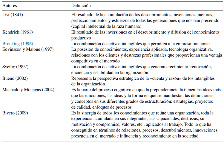 Bueno, Salmador y Merino (2008) y Monagas-Docasal (2012) han recopilado una serie de definiciones del capital intelectual las cuáles se presentan en la tabla 2 manifestando que todas ellas muestran cierto grado de heterogeneidad y el estado aún emergente del concepto.