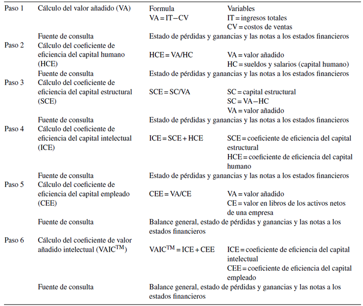 Pulic (2004), Kujansivu y Lonnqvist (2007) y Laing, Dunn y Hughes-Lucas (2010) han estructurado metodológicamente 6 pasos para llegar al cálculo del VAICTM los cuales quedan ilustrados en la tabla 4.