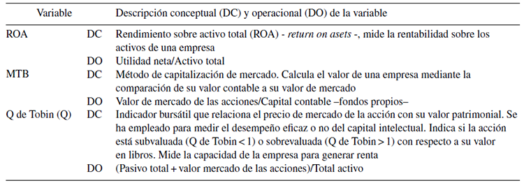 En la tabla 6 se detallan las variables dependientes las cuales reflejan los resultados financieros de cada empresa, estas son: la ROA, el MTB y la Q de Tobin.