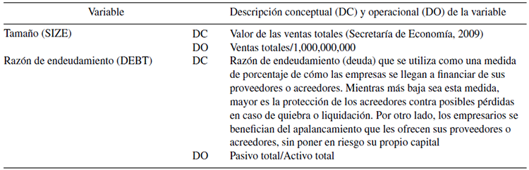 En la tabla 7 se explican las variables de control, que son SIZE y DEBT.