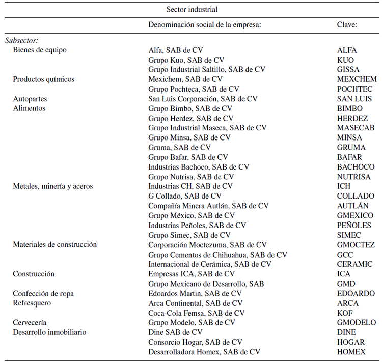En la tabla 8 se señalan las 32 empresas que conforman la muestra del sector industrial en base al subsector al que pertenecen y cuya población se ilustra en la figura 2. Cabe señalar que solamente se seleccionaron las empresas que han publicado el rubro de sueldos y salarios en sus estados financieros, por ser este un dato básico en el cálculo del VAICTM.