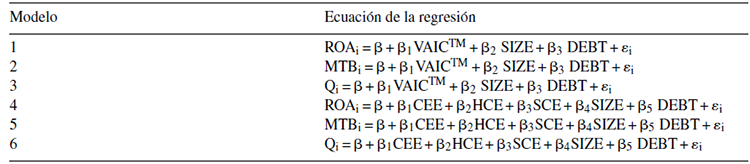 A través de los modelos 1 a 3 se analiza la relación que existe entre el índice del VAICTM y los indicadores financieros que miden la rentabilidad, la capitalización de mercado y el valor de mercado de la acción. En los siguientes 3 modelos (4-6) se emplean separadamente los componentes del VAICTM (HCE, SCE y CEE) y los indicadores financieros que miden la rentabilidad, la capitalización de mercado y el valor de mercado de la acción, teniendo en todos ellos como variable de control el SIZE y el DEBT.