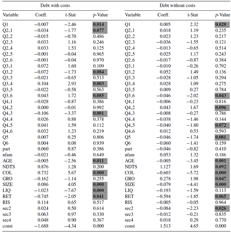 Table 1 shows the results of the regressions based on the proposed (dependent) debt variables: "debt with costs" and "debt without costs".