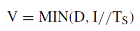 (7)El inventario se conforma por las unidades que se producen Q menos las unidades que se venden V, que a su vez dependen de la demanda D, de las existencias y del tiempo que se tiene para surtir los pedidos TS (ecuación 8).