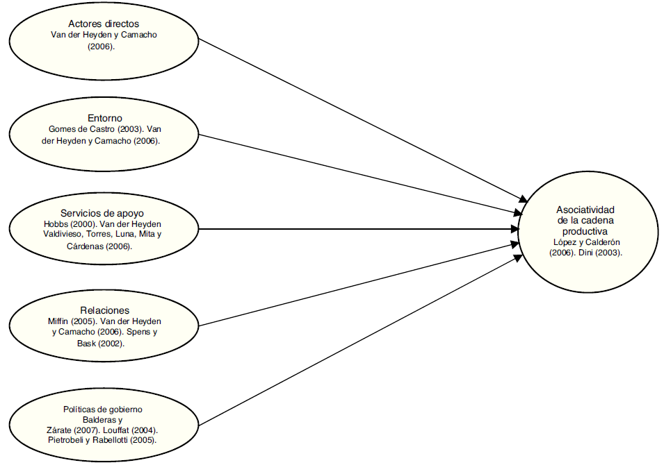 En la figura 1 se muestra el modelo ex ante que se construye con base en la evidencia empírica reportada en el estado del arte. Cada variable independiente -actores directos, entorno, servicios de apoyo, relaciones y políticas de gobierno- tiene su fundamentación teórica, y de la misma manera la variable dependiente: asociatividad. La operacionalización de las variables se realizó tomando en cuenta la variable, la definición conceptual, las dimensiones y los indicadores.