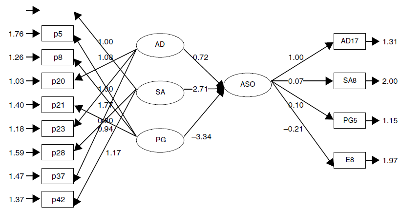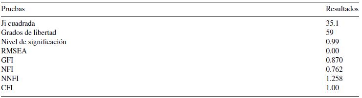 Finalmente, y al aplicar el moldeamiento de ecuaciones estructurales, se emplearon las pruebas ji cuadrada, aproximación de la raíz cuadrada media del error (RMSEA), índice de bondad de ajuste (GFI) e índice de ajuste comparativo (CFI). Jaccard y Wan (1996) recomiendan que se realicen tres pruebas de las antes mencionadas; por otro lado, Kline (1998) propone que como mínimo se consulten cuatro. En la tabla 6 se muestra el resultado de estas pruebas; en lo que respecta a ji cuadrada es significativa, porque es mayor de 0.05; el dato de RMSEA es menor de 0.08, por lo que es satisfactorio; el GFI indica un valor de 0.870, el cual apoya al modelo porque su valor se acerca a 0.90; el CFI cercano a 1 indica un buen ajuste, por lo que los valores superiores a 0.90 se consideran aceptables. Los resultados reportados en la tabla 6 apoyan el ajuste entre el modelo teórico y los datos empíricos.