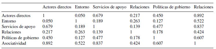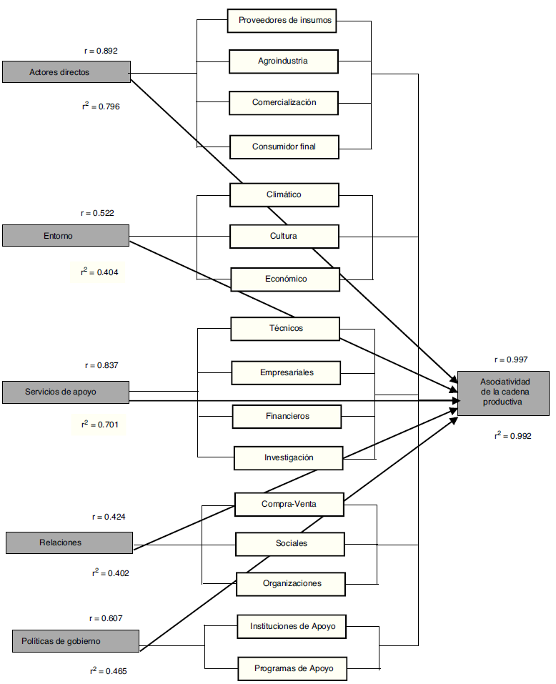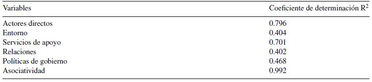 En cuanto al coeficiente de determinación, tuvo altas correlaciones en los actores directos, los servicios de apoyo y la asociatividad, según se muestra en la tabla 4.