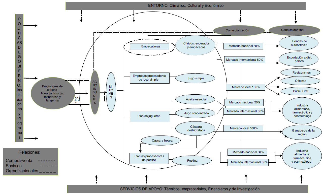 El modelo de asociatividad propuesto en la cadena productiva es un sistema productivo donde los actores directos que lo forman son los productores de cítricos, la agroindustria, la comercialización y los consumidores finales; el actor que tiene relevancia en el modelo es la agroindustria, y dentro de este eslabón se encuentran las MIPYMES agroindustriales en cítricos, que son las cepilladoras, las empacadoras y las enceradoras (comúnmente llamadas por los originarios de la región como empacadoras), empresas procesadoras de jugo simple, plantas jugueras y plantas deshidratadoras y procesadoras de pectina. Las empacadoras reciben los insumos de los productores de cítricos de la región y realizan procesos agroindustriales simples, esto quiere decir que solo cepillan, lavan, enceran y empacan los cítricos ya sea a granel (sin encerar) o en cajas de madera (enceradas); el 98% son microempresas y el 2% son pequeñas empresas. De estos cítricos, el 50% se destina al mercado nacional, principalmente a la central de abastos de la ciudad de México D.F y Guadalajara, y a las tiendas de autoservicio como Walmart, Chedraui, Gigante y Sams. El 50% restante es fruta de exportación, que se destina principalmente a Estados Unidos Canadá y Francia.