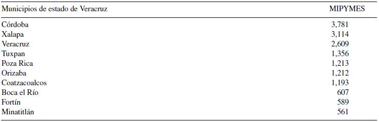 De acuerdo al Sistema de Información Empresarial Mexicano (SIEM, 2014), los municipios más representativos en cuanto a las MIPYMES registradas (tabla 1) son Córdoba, Xalapa y el puerto de Veracruz, con actividades de comercio y portuarias, situadas en el centro del estado; Tuxpan y Poza Rica, ubicadas en la zona norte del estado, con actividades de comercio y petróleo; los municipios de Orizaba, Coatzacoalcos, Boca del Río, Fortín y Minatitlán tienen actividades industriales y comerciales principalmente y actividad portuaria.