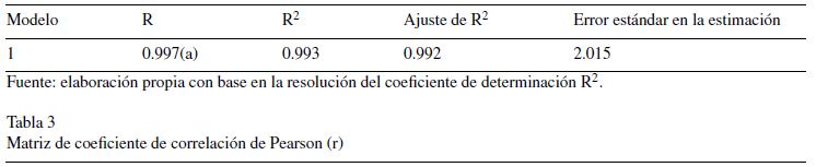 Los resultados de las correlaciones de Pearson y el coeficiente de determinación R2 presentaron correlaciones significativas (tablas 3 y 4); los valores de las variables independientes oscilan entre 0.424 y 0.892, correlación de Pearson, y entre 0.402 y 0.796 la correlación R2, lo que significa que tienen una correlación moderada sustancial y marcada alta de cada una de las variables independientes con la variable dependiente asociatividad. Las variables independientes en su conjunto explican el 0.993, y R2 la asociatividad de la cadena productiva (variable dependiente). La tabla 3 resume la evidencia estadística encontrada.