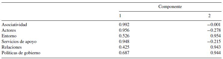 En el análisis de factores (tabla 5) se obtuvieron dos factores; el primer factor está constituido por 3 variables: asociatividad, actores directos y servicios de apoyo, lo que podría representar la interacción significativa de estas variables en la cadena productiva. El segundo factor recoge el grupo de variables: entorno, relaciones y políticas de gobierno, por lo que podría representar los elementos que están de soporte en la cadena productiva; ambos factores tienen relación con la cadena productiva.