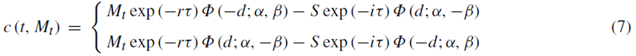utilizando el supuesto de que los rendimientos tienen una distribución log-gaussiana donde Mt es valor del índice, S es el precio de liquidación (3,172.63 puntos), r es la tasa de dividendos del índice y σ es la volatilidad de los rendimientos del índice. La valuación de las opciones de compra se realiza con el modelo log-estable: