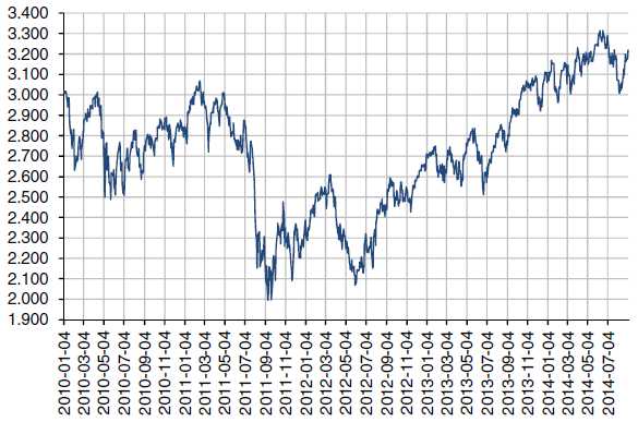 El subyacente utilizado en esta investigación es el SX5E, que es un índice bursátil compuesto por las 50 acciones más líquidas de la zona euro. El desempeño del Eurostoxx durante el periodo del 4 de enero de 2010 al 3 de septiembre de 2014 se presenta en la figura 1, donde se puede observar el desempeño del Eurostoxx hasta el día hábil inmediato anterior de la emisión del bono bancario estructurado de compra sin pérdida de capital al vencimiento y referenciados al Eurostoxx con 1,201 observaciones que presentan un mínimo de 1,995.01 y un máximo de 3,314.80 puntos.