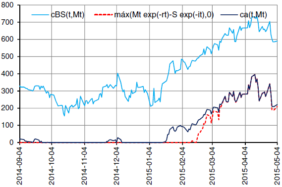 donde BT es el valor nominal del bono, T es el tiempo de maduración del bono, τ = T − t es el tiempo remanente del bono e i es la tasa de interés instantánea equivalente a la tasa de interés simple is , de tal forma que es la tasa aplicada en la estructuración. El capital restante para la posición larga en opciones europeas de compra sobre el Eurostoxx es: