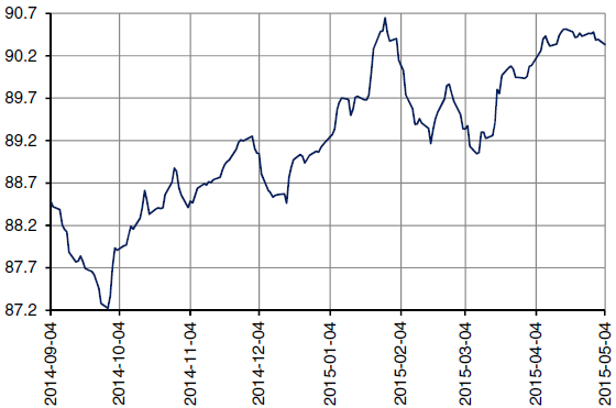 Los precios de las opciones de compra deben ser positivos y deben ser mayores que la diferencia entre el valor presente del precio subyacente a la tasa de dividendos del índice y el valor presente del precio de liquidación a la tasa doméstica, y deben ser menores que el precio del subyacente para evitar oportunidades de arbitraje. La valuación de las opciones europeas de compra a través de los modelos log-gaussiano y log-estable utilizando se presenta en la figura 10, en la que se muestran las valuaciones de las opciones europeas de compra a través del modelo log-gaussiano (línea cielo), las valuaciones de las opciones europeas de compra a través del modelo log-estable (línea marino) y los límites inferiores para las valuaciones de las opciones europeas de compra (línea discontinua roja); las valuaciones log-gaussianas presentan un mínimo de $154.5342 y un máximo de $736.8478, con un diferencial de $582.3136, mientras que las valuaciones log-estables presentan un mínimo de $0.00 y un máximo de $395.1987, con un diferencial de $395.1987. La diferencia mínima entre las valuaciones de los modelos utilizados durante el periodo de valuación fue de $154.5342 el 16 de octubre de 2014, y la diferencia máxima fue de $402.6041 el 17 de abril de 2015. Se puede observar que las valuaciones log-gaussianas son mayores que las valuaciones log-estables, confirmando que el modelo log-gaussiano sobrestima los eventos de bajo impacto financiero y económico. Las valuaciones log-estables se aproximan a las valuaciones log-gaussianas cuando el Eurostoxx incrementa o desciende y los otros factores permanecen constantes. La diferencia máxima es de $482.9548 y se presenta cuando el índice alcanza los 4,180 puntos; al incrementar o disminuir la diferencia es decreciente. La valuación del bono se presenta en la figura 11, donde se muestran las valuaciones del bono en función de la estructura de las tasas de interés cupón cero. Las valuaciones presentan un mínimo de $87.2236 y un máximo de $90.6480, con un diferencial de $3.4244. En el prospecto del bono bancario estructurado referenciado al índice SX5E se indica que el pago, en pesos, es el monto siguiente: