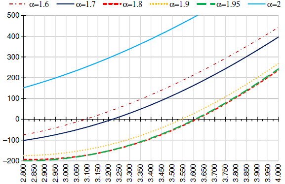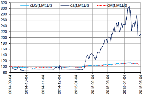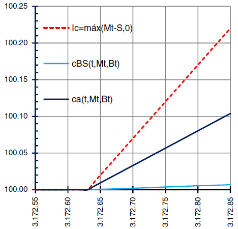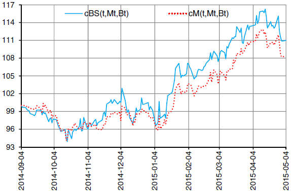 donde el producto de cien veces el factor de participación y el valor máximo del cociente entre la valuación de la opción sobre el Eurostoxx y el precio de liquidación o cero es la monetización de las opciones y representa las ganancias adicionales, en pesos, que los inversionistas pueden obtener con el producto estructurado. En la fecha de emisión el valor del bono es $88.4874, y el capital restante para la posición larga en opciones europeas de compra sobre el Eurostoxx es de $11.5126, por lo que el factor de participación para el modelo log-gaussiano es de solo una opción, porque el precio de la opción europea es $328.9045, la monetización es $10.3669 y el emisor obtiene una comisión de $1.1457 por cada producto estructurado para un precio de emisión de $100.00; el factor de participación para el modelo log-estable es de quince opciones, debido a que el precio de las opciones asciende a $20.9925, la monetización es $0.6617 y el emisor obtiene una comisión de $1.5875 por cada producto estructurado para un precio de emisión de $100.00. Las valuaciones de los productos estructurados a través del modelo log-gaussiano y log-estable se presentan en la figura 12, donde se muestran las valuaciones del producto estructurado de capital garantizado a través modelo log-gaussiano (línea cielo), las valuaciones del producto estructurado a través del modelo log-estable (línea marino) y los precios de mercado (línea punteada roja), que son semejantes a las valuaciones log-gaussianas. Las valuaciones log-gaussianas presentan un mínimo de $93.3655 y un máximo de $113.7071, con un diferencial de $20.3416; las valuaciones log-estables presentan un mínimo de $87.2237 y un máximo de $277.1856, con un diferencial de $189.9619, y los precios de mercado presentan un mínimo de $94.1255, un máximo de $112.8350 y un diferencial de $18.7095. Las valuaciones log-gaussianas son mayores que las valuaciones log-estables hasta el 20 de enero de 2015, y a partir del 21 de enero de 2015 las valuaciones log-estables son superiores a las log-gaussianas, confirmando que el modelo log-gaussiano sobrestima eventos de bajo impacto financiero y económico y subestima eventos de alto impacto financiero y económico. Las valuaciones log-estables cuantifican más adecuadamente el riesgo de mercado y las ganancias se reflejan cuando el valor del índice incrementa y la valuación de las opciones log-estables también incrementa, y además el factor de participación multiplica las ganancias de la nota estructurada. El modelo log-estable permite mayores comisiones para los emisores por cada producto estructurado y permite obtener mayores ganancias a los inversionistas. Las valuaciones de los productos estructurados del modelo log-gaussiano y el precio de mercado se presentan en la figura 13, en la que se muestran los valores producto estructurado log-gaussiano (línea cielo) y los precios de mercado (línea punteada roja); la diferencia máxima del producto estructurado log-gaussiano y el precio de mercado es $3.1012, que se presentó el 16 de marzo de 2015, representando una diferencia del 2.9221%, y la mínima es $0.0089, que se presentó el 18 de diciembre de 2014, representando una diferencia del 0.0089%. Se puede observar que en las fechas más recientes el valor de mercado es menor que el precio teórico del modelo log-gaussiano, lo que disminuye las ganancias de los inversionistas. Los precios de las opciones en función del subyacente y del parámetro de estabilidad se presentan en la figura 14, en la que se pueden apreciar los precios de la opción log-gaussiana (línea cielo) y los precios de las opciones log-estables en función del valor de subyacente (incluye el mínimo 2,874 puntos y el máximo 3,828 puntos durante el periodo de valuación), del parámetro de estabilidad (línea marino 1.6945, línea discontinua y punteada púrpura 1.6, línea discontinua roja 1.8, línea punteada amarilla 1.9 y línea discontinua verde 1.95) y sin considerar el límite inferior en el valor de las opciones; en la fecha de valuación, el índice presentó un valor de 3,277.25 puntos y el valor teórico de la opción log-gaussiana y los valores teóricos de las opciones log-estables, que se encontraban dentro de dinero, fueron positivos, $328.9045 y $ 20.9925, respectivamente; se puede apreciar que la valuación de la opción log-gaussiana sobrestima las valuaciones de las opciones log-estables con diferentes parámetros de estabilidad y el factor de participación del modelo log-estable es superior al factor del modelo log-gaussiano, multiplicando las ganancias de los inversionistas log-estables quince veces para la distribución estimada fx (x,1.6945,−0.1707) cuando el índice rebasa los 3,245 puntos el día 21 de enero de 2015, por lo que el factor de participación es el multiplicador que permite a los inversionistas log-estables obtener mayores ganancias cuando el índice aumenta su valor, ya que multiplica las ganancias por el pago de las opciones dentro de dinero y, en caso de que las opciones fuera de dinero no obtengan ganancias, entonces los inversionistas solo reciben el valor nominal del bono en la fecha de vencimiento; también se puede observar que los precios log-estables son inferiores a los log-gaussianos en una posición cercana a las opciones en dinero. Este comportamiento es explicado porque la función de densidad log-gaussiana presenta una masa de probabilidad mayor en valores adyacentes al precio de liquidación y las funciones de densidad log-estables presentan una masa de probabilidad en los extremos de la distribución; la mayoría de las opciones son valuadas con precios de liquidación adyacentes al precio forward o precio futuro del subyacente como un precio justo considerando los insumos del mercado en la fecha de negociación, por lo que las opciones son valuadas en un intervalo adyacente a cuando están en dinero, un poco fuera de dinero o un poco dentro de dinero, pero no 