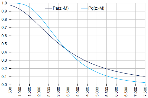 El precio subyacente en la fecha de emisión es M0 = 3, 277.25, el parámetro de escala histórico anual es γ = 0.25470617 y la distribución de los rendimientos del Eurostoxx es Z ∼ S11.6945, -0.1707; entonces, a través de la ecuación (12) se calcula el intervalo de confianza del 95% para los 170 días hábiles donde se ha valuado el producto estructurado, siendo este 1, 556.93 ≤ MT ≤ 6, 297.03, que incluye al intervalo de confianza cuando Z ∼ S12, que es 2, 318.08 ≤ MT ≤ 4, 662.78. Los valores del índice previos a la fecha de valuación son 1,995.01 como mínimo y 3,314.78 como máximo, donde el valor mínimo está fuera del intervalo log-gaussiano y los valores del índice durante el periodo de valuación son 2,874.65 como mínimo y 3,828.78 como máximo, periodo en el que no se observaron eventos de alto impacto financiero y económico. El intervalo de confianza indica que el valor del índice tiende a bajar con mayor frecuencia que a subir, información que los inversionistas desconocen. El intervalo de confianza del 95% durante el periodo de vigencia del producto estructurado para el precio subyacente en la fecha de vencimiento es 1, 556.93 ≤ MT ≤ 6, 297.03, que incluye el intervalo de confianza cuando Z ∼ S12, que es 2, 169.73 ≤ MT ≤ 4, 995.23. La probabilidad de obtener ganancias en la fecha de vencimiento se calcula mediante: