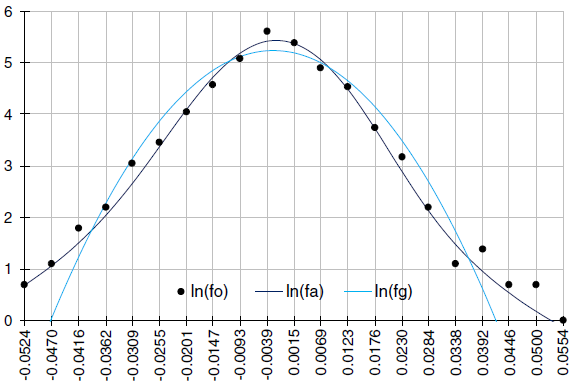 Las probabilidades en función del valor del índice se presentan en la figura 15, y también las probabilidades de que la variable Z (valor del índice) supere el valor indicado en el eje horizontal en la fecha de vencimiento -como se puede apreciar las probabilidades log-gaussianas (línea cielo)- son superiores a las probabilidades log-estables (línea marino) hasta que valor del índice supera los 3,390 puntos. Ambas probabilidades son decrecientes, esto es, las probabilidades de obtener ganancias mayores son monótonas decrecientes; por ejemplo, la probabilidad de que las opciones log-estables se encuentren dentro de dinero es del 47.69%, y la probabilidad de que las opciones log-gaussianas se encuentren dentro de dinero es del 49.60% cuando el valor del índice supera los 3,172.63 puntos, mientras que las probabilidades de que el valor del índice supere los 4,000 puntos son del 34.45 y del 30.03% para las opciones log-estables y log-gaussianas, respectivamente. El logaritmo de la frecuencia del rendimiento subyacente se presenta en la figura 16, en la que se puede apreciar que la estimación de los rendimientos es más adecuada a través de la distribución log-estable (línea marino), ya que modela más adecuadamente la curtosis y la asimetría de los rendimientos observados (puntos negros) que la distribución log-gaussiana (línea cielo), por lo que el modelo log-estable cuantifica mejor que el modelo log-gaussiano las frecuencias de pérdidas y ganancias de alto y bajo impacto financiero y económico por la inversión en el Eurostoxx, las opciones sobre el Eurostoxx y los productos estructurados de capital garantizado valuados en este trabajo.