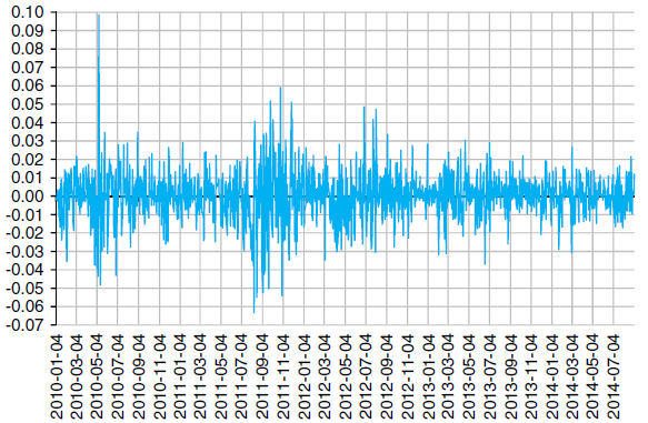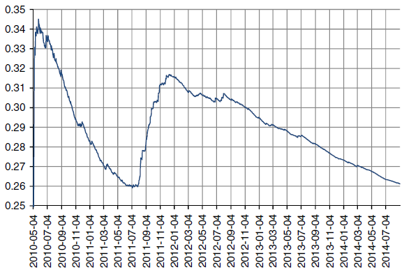 El periodo utilizado para estimar los parámetros α-estables de la distribución de los rendimientos del Eurostoxx es del día 4 de enero de 2010 al 3 de septiembre de 2014, periodo que comprende 1,201 observaciones para el índice y 1,200 observaciones para los rendimientos logarítmicos. Los rendimientos diarios del Eurostoxx se presentan en la figura 2, donde se puede observar el desempeño de los rendimientos diarios del Eurostoxx que presentan un mínimo de −6.3182% y un máximo de 9.8466%. El desempeño de las volatilidades históricas anuales del Eurostoxx se presenta en la figura 3, donde se puede observar el desempeño de las volatilidades históricas anuales que presentan un mínimo de 1.08% y un máximo de 34.51%. Las volatilidades históricas anuales presentan una tendencia a la baja desde el 11 de diciembre de 2011 hasta el día hábil inmediato anterior a la emisión del producto estructurado. La estimación de los estadísticos básicos de los rendimientos diarios del Eurostoxx se presenta en la tabla 1, donde el promedio indica que los rendimientos del Eurostoxx se aprecian. El coeficiente asimetría positivo indica que los rendimientos tienen una distribución que se extiende hacia valores positivos con mayor frecuencia que hacia valores negativos. El coeficiente de curtosis indica que la distribución de los rendimientos es leptocúrtica con respecto a la distribución gaussiana, por lo que los rendimientos del Eurostoxx tienen una distribución asimétrica y leptocúrtica.