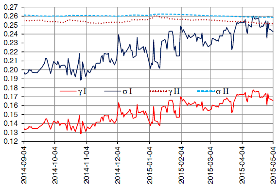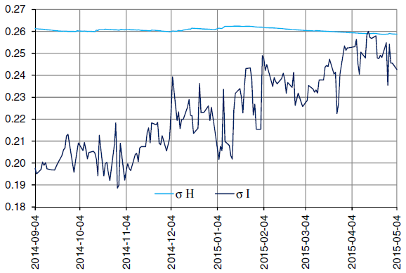 y representa las ganancias adicionales por la inversión en las opciones log-estables y la línea cielo representa la ganancia del producto estructurado log-gaussiano considerando el factor de participación y la monetización de la opción log-gaussiana; como se puede apreciar, las utilidades en la fecha de vencimiento del producto estructurado log-estable son superiores a las log-gaussianas cuando valor del índice supera el precio de liquidación al vencimiento, y esto se debe al factor de participación, que en el caso log-estable incluye en la estructura del portafolio quince opciones contra una opción en el portafolio log-gaussiano, potenciando las ganancias del portafolio log-estable por el pago al vencimiento de la opción. La comparación de las volatilidades históricas e implícitas anuales durante el periodo de valuación se presenta en la figura 8, donde se muestra la comparación de las volatilidades históricas (línea cielo) e implícitas (línea marino) anuales durante el periodo de valuación; las volatilidades implícitas presentan un mínimo del 18.8544% y un máximo del 25.9993%, con un diferencial de 715 puntos porcentuales, y las volatilidades históricas presentan un mínimo del 25.8675% y un máximo del 26.2418%, con un diferencial de 38 puntos porcentuales. Se puede observar que el 15 de abril de 2015 es el único día que la volatilidad implícita es mayor que la histórica, lo que significa que las opciones europeas de compra sobre el Eurostoxx están subvaluadas excepto el 15 de abril de 2015, porque se utiliza la volatilidad implícita en la valuación.