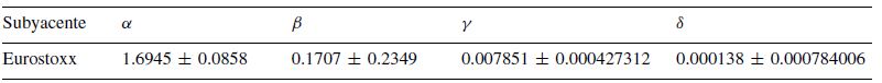 Las características de los rendimientos del Eurostoxx indican que la distribución es asimétrica y leptocúrtica; para modelar los rendimientos se realiza la estimación de parámetros α-estables a través del método de estimación de verosimilitud máxima, que son los valores que maximizan la función de verosimilitud y que es el estimador asintóticamente más eficiente, y que está dado por la matriz de información de Fisher, y la función de densidad puede ser expresada en términos de funciones G de Meijer, representación que no es práctica para evaluar funciones de densidad α-estables de acuerdo con la investigación de Nolan (2001). La estimación de parámetros α-estables al 95% de confianza se presenta en la tabla 2.