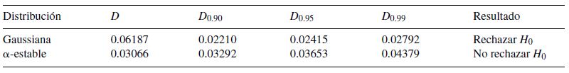 El análisis cuantitativo para probar la hipótesis nula H0 de que los rendimientos del Eurostoxx presentan una distribución α-estable contra la hipótesis alternativa H1 de que los rendimientos no presentan una distribución α-estable se realiza a través del estadístico Kolmogorov-Smirnov, que se presenta en la tabla 3.