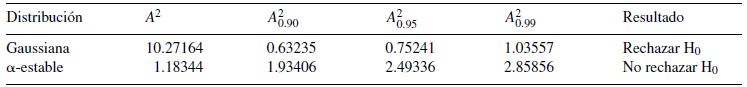 Otra prueba para la hipótesis nula H0 de que los rendimientos presentan una distribución α-estable contra la hipótesis alternativa H1 de que los rendimientos no presentan una distribución α-estable se realiza a través del estadístico de bondad de ajuste Anderson-Darling, que se presenta en la tabla 4.