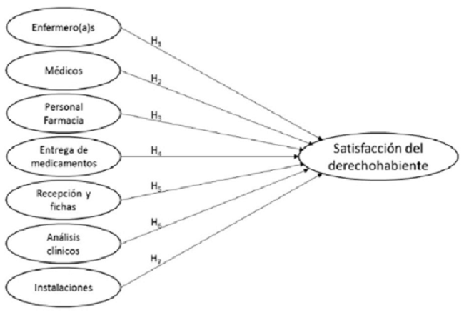 Aunque en este tipo de estudios típicamente se plantea la satisfacción como un factor mediador entre la calidad del servicio y la lealtad del cliente, en este caso la relación sólo se plantea entre calidad del servicio (como variables independientes) y la satisfacción como variable dependiente final. Esto debido a que en el sector de instituciones de salud del Estado, el derechohabiente tiene pocas posibilidades de elegir la institución en la cual atender sus necesidades de salud. Aquí, un trabajador del Estado es forzosamente inscrito en el ISSSTE y un trabajador del sector privado es forzosamente inscrito al IMSS. Así, aquel mexicano que no goza de seguridad social, le queda como única posibilidad, por parte del Estado, la SSa o el Seguro Popular. Por esta razón no se implementan variables relacionadas a las preferencias e intenciones del cliente. Sin embargo, aunque el derechohabiente tiene pocas posibilidades de elección, aquí se considera que debe ser obligación del Estado, y de estas instituciones, ofrecer el mejor servicio posible a sus afiliados (clientes).