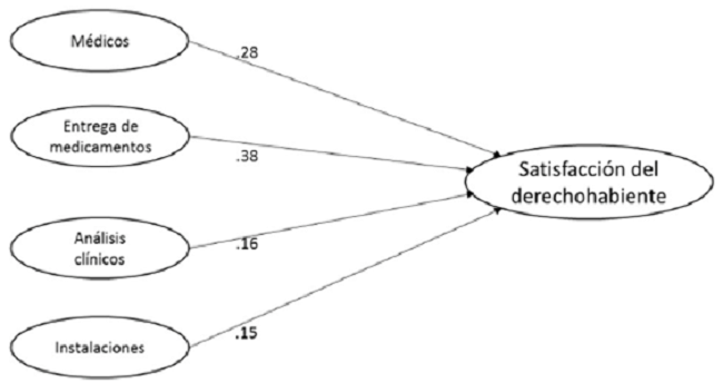 En la Tabla 8 se pueden ver los resultados de los pesos de regresión entre las variables latentes en los modelos estructurales. En el primer modelo se introdujeron todas las variables latentes independientes (dimensiones de calidad del servicio) para determinar si existe un efecto sobre la variable latente de satisfacción del derechohabiente. Aquí, sólo tres variables latentes independientes mostraron pesos de regresión estadísticamente significativos hacia la satisfacción: servicio del médico, entrega de medicamentos e instalaciones. Entrega de medicamentos con el valor del peso de regresión más alto.