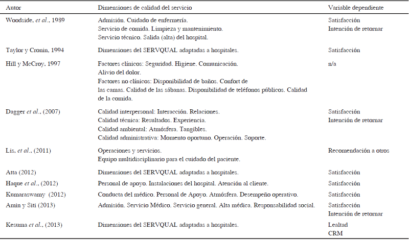 La Tabla 1 muestra en orden cronológico dimensiones de calidad del servicio que han sido propuestas anteriormente en estudios que han abordado la medición de calidad del servicio en instituciones de cuidado de la salud. En esta tabla, en la primera columna se reportan los autores y la fecha de publicación, en la segunda se enlistan las dimensiones que se han propuesto, y en la tercera se muestran las variables dependientes de comportamiento en las que tendría efecto las dimensiones de calidad del servicio.