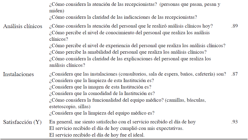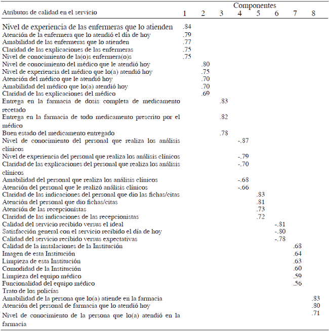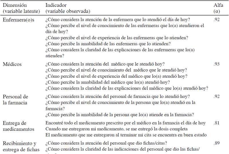 A diferencia de estudios anteriores sobre medición de calidad del servicio en centros de salud. En el presente estudio se partió de una indagación exploratoria donde se realizó una detección muy detallada de atributos. De tal forma aquí se trabajó con 32 atributos muy específicos de calidad del servicio en el sector de clínicas de primer nivel de instituciones del Estado (ver Tabla 2). Enfoques anteriores (Babakus y Mangold, 1992; Murti et al., 2013) han retomado el instrumento SERVQUAL (Parasuraman et al., 1985) adaptando sus reactivos al servicio de centros de salud. Esta batería mide dimensiones generalizables a cualquier tipo de servicio como: tangibles, confiabilidad, respuesta, aseguramiento y empatía. Si bien el uso del SERVQUAL permite una mayor generalización de las conclusiones por este carácter estándar, aquí se considera que también ofrece menor explicación del fenómeno en particular bajo estudio. El haber detectado atributos muy específicos con base en el análisis del proceso de servicio que sigue un derechohabiente permite ofrecer una explicación más detallada de los generadores de satisfacción para los usuarios.