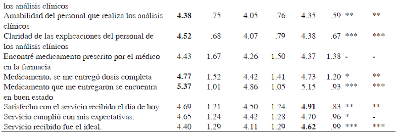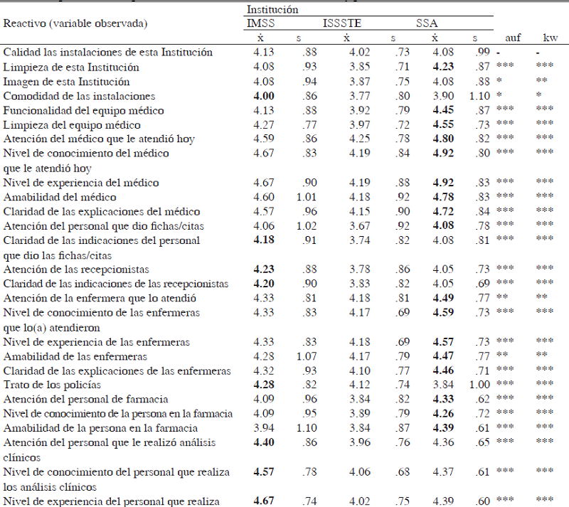 En la Tabla 4 se muestran resultados descriptivos del estudio. En esta tabla se puede apreciar que se dieron diferencias significativas entre instituciones en la mayoría de cada uno de los atributos medidos. Los valores más altos fueron obtenidos entre dos de las tres instituciones utilizadas en este trabajo. Para confirmar diferencias entre las instituciones fueron utilizadas pruebas de diferencias para muestras independientes. Cada muestra independiente corresponde a los derechohabientes de cada una de las instituciones. Para este propósito, se utilizaron dos pruebas distintas, por un lado, una prueba paramétrica: prueba anova de un factor para diferencias de medias. Para confirmar las diferencias, y para evitar discusiones sobre el nivel de medición y la normalidad de los datos por provenir de escalas de actitud, se utilizó también una prueba no paramétrica: prueba Kruskal Wallis para diferencia de distribuciones. Como se puede apreciar en la Tabla 4 los resultados de ambas pruebas se confirman entre sí en todos los casos a excepción de una de las mediciones de satisfacción.