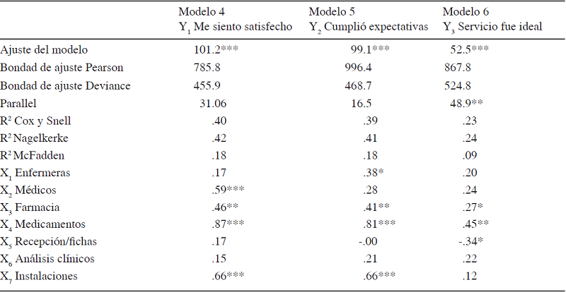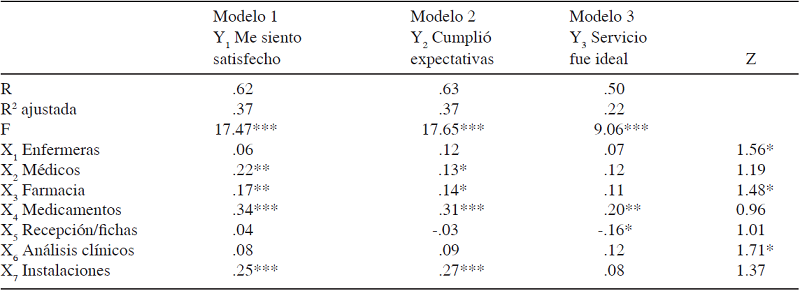 Los resultados de estos análisis de regresión pueden verse en la Tabla 5. De las siete variables independientes cuatro resultaron significativas (médicos, farmacia, medicamentos e instalaciones) para dos de las mediciones de satisfacción (satisfacción general y cumplió expectativas). Para la tercera medición de satisfacción (ideal) sólo dos variables independientes resultaron significativas (medicamentos y recepción de fichas).